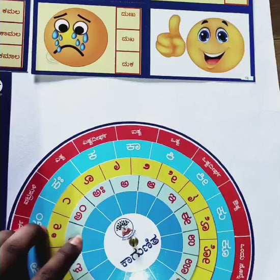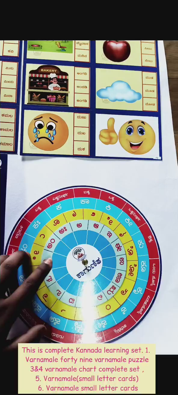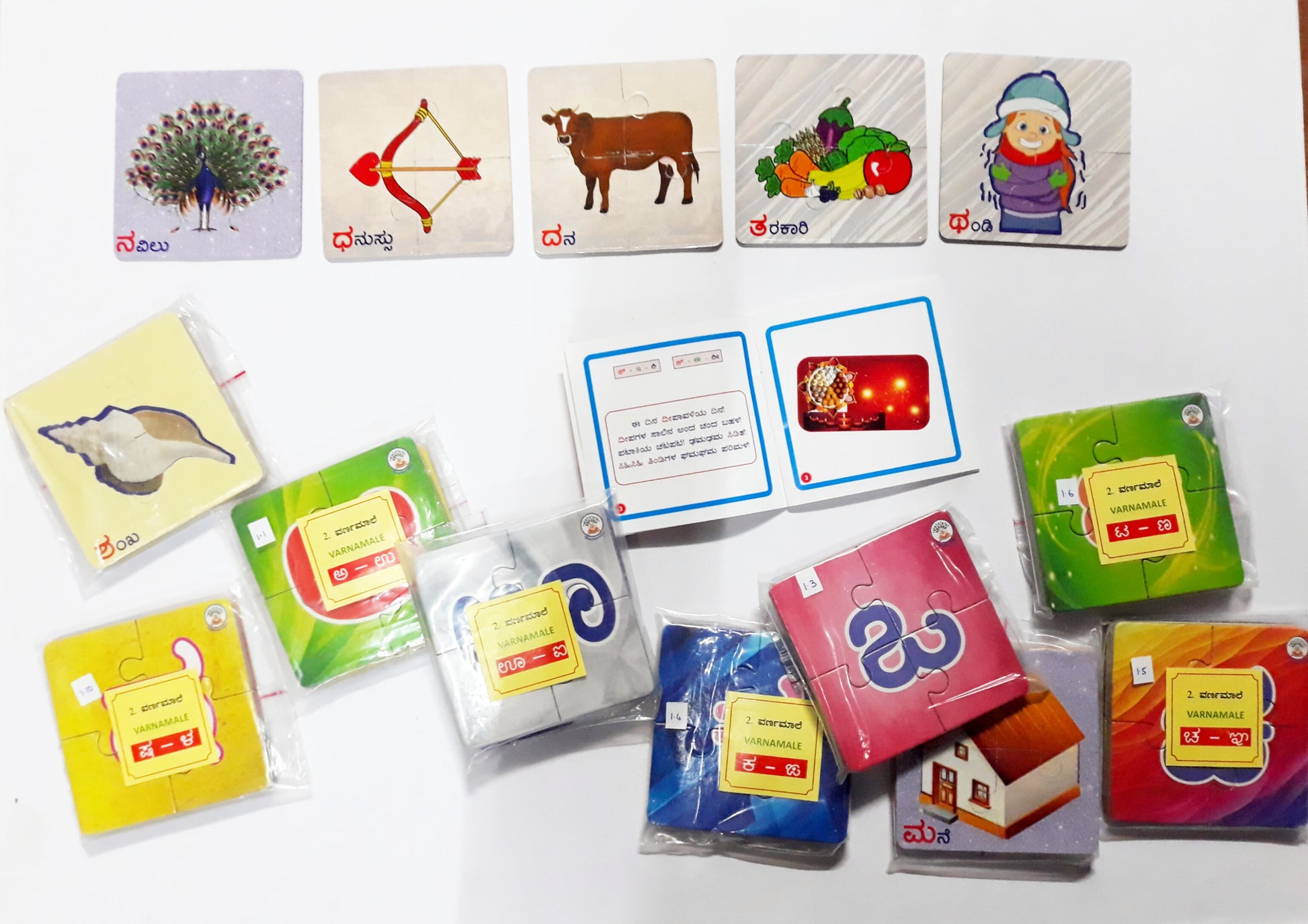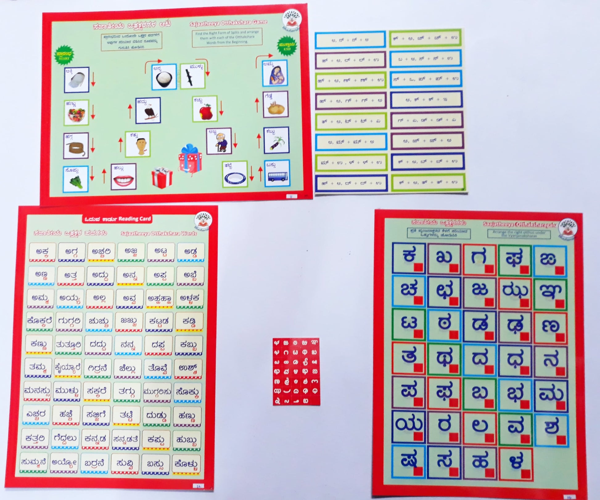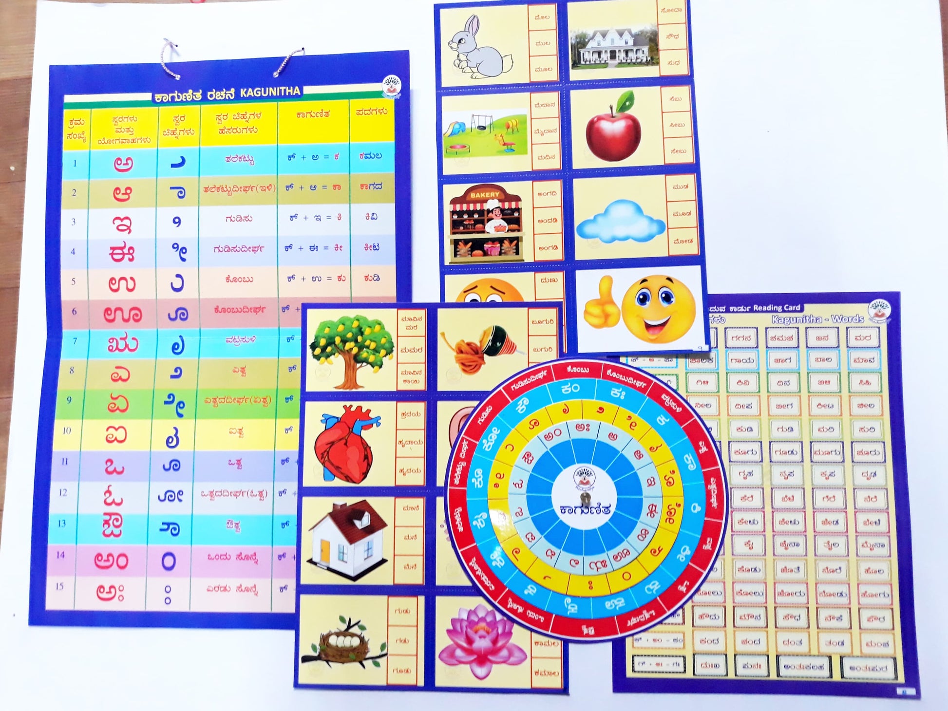 This is complete Kannada Learning Set. What you get in this set details are given below from 1 to 23 No1. This Set has Instruction’s Hand Book, 2. VARNAMALE Forty Nine Varnamale Puzzle, 3.& 4. Varnamale Chart (complete Varnamala and divisions front and back), 5. Varnamale (small letter cards), 6. Varnamale small letter cards. 7 & 8. KAAGUNITHA GUNITHAKSHARAS Kaagunitha formation and all Kaagunithas big chart front and back, 9. Kaagunitha Wheel, 10. Kaagunitha picture card with words (15 words), 11. Kaagunitha word vocabulary card, 12 & 13. Sajaatheeya ottakashara card, Sajaatheeya otthu and Vynajanakshara matching cards back to back, 14. Sajaatheeya ottakashara game (one main card and sixteen small matching cards), 15. Sajaatheeya ottakashara word vocabulary card, 16 & 17. VIJAATHEEYA OTTAKSHARAS card and word formation with two examples, 18. Vijaatheeya ottakashara pictures, words and split forms matching cards (twelve sets of three cards), 19. Vijaatheeya ottakashara word vocabulary card, 20. ARKAAVALI ARKAVATTU word formation and examples 21. Arkaavali Arkavattu matching cards (six sets of two cards), 22. Arkaavali Arkavattu words and vocabulary cards, 23. Towards complete reading, Small colorful reading book
