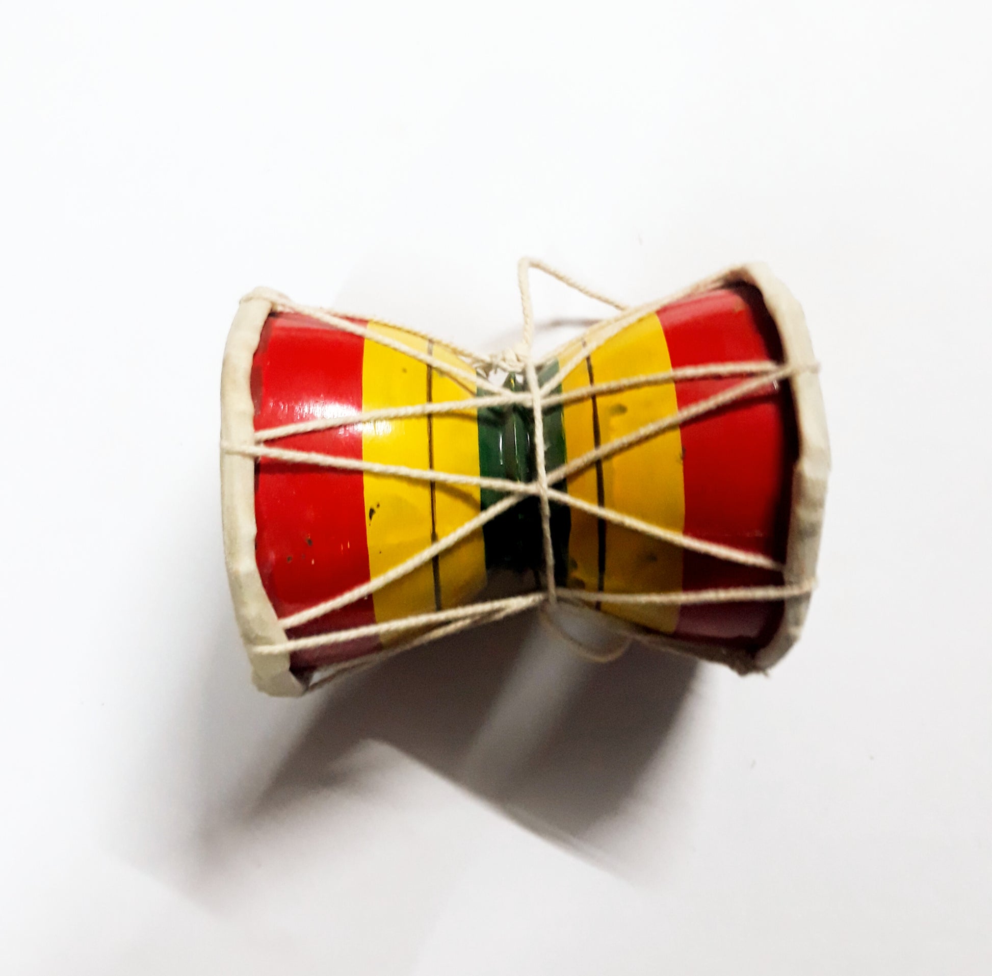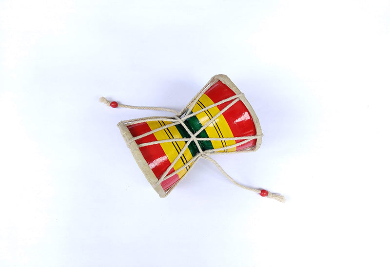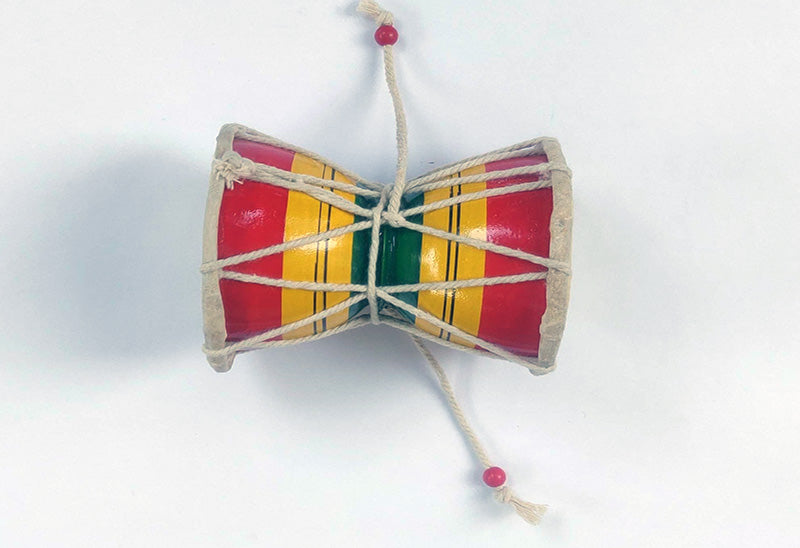 Music plays a very important role in a child's early years. Damroo is an hourglass shaped drum, typically played with the bare hands, a child waves the instrument by twisting the wrist back and forth. Playing damroo by beating is a nice way to develop motor coordination, rhythm and concentration skills. It's an accompaniment in folk songs and dances. Handmade by artisans of Uttar Pradesh in north India.