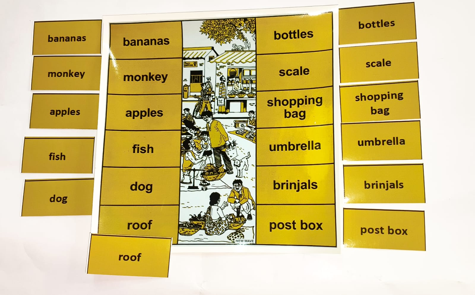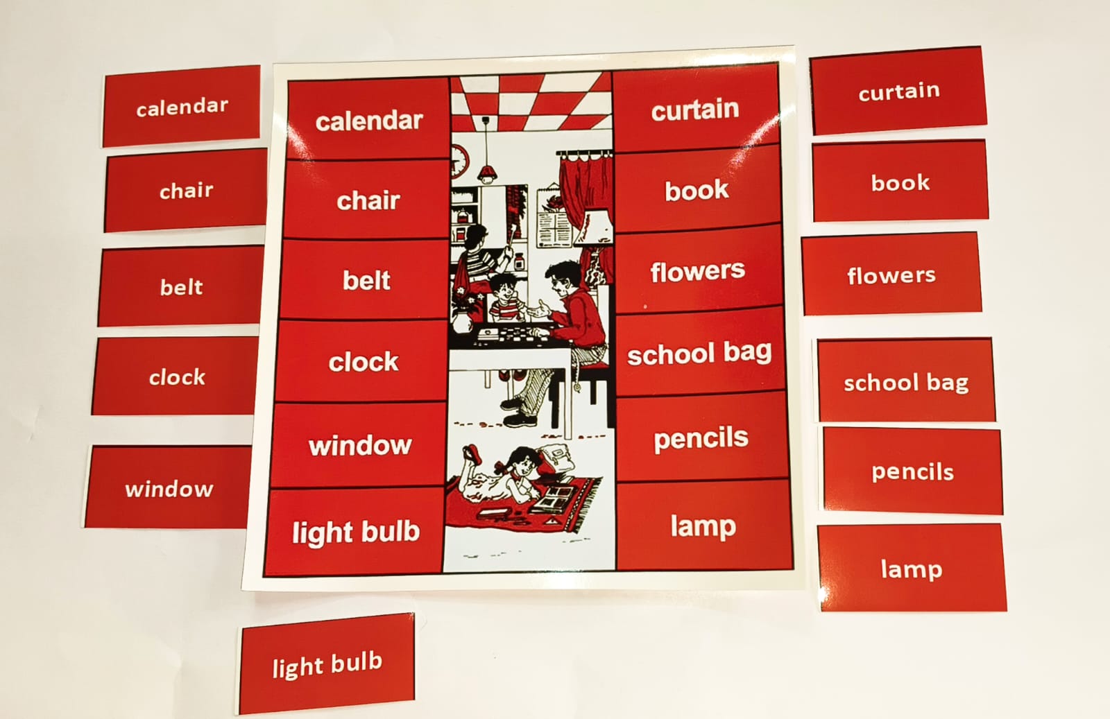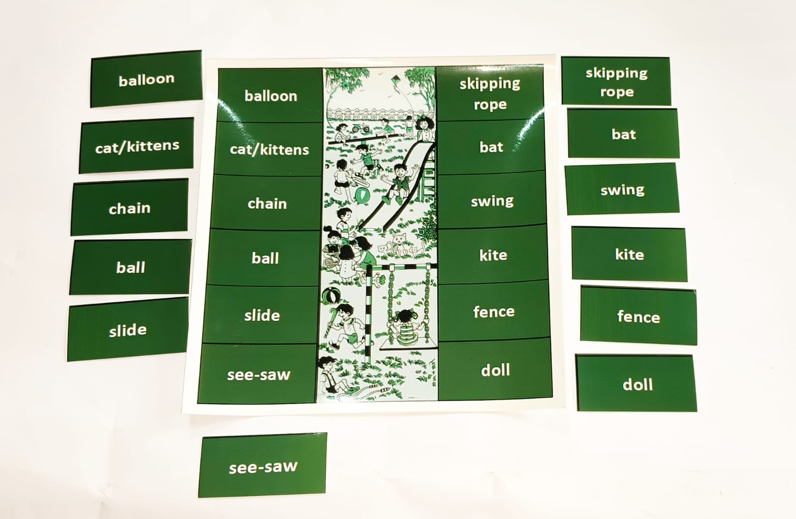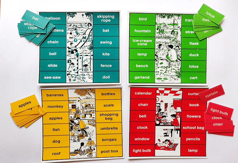 Eye Spy Find It Puzzle Game 4 self checking base boards with center panels pictures of different every day scenes and side panel of list of names of objects in each pictures. 48 small item cards showing a detail from one of the pictures. The name of the object is printed at the back of each small cards which is colour coded to match the colour of the corresponding base boards. The objects on the item card are shown at slightly different angles or on different positions from those in the main picture, so the child must look very carefully to find it.