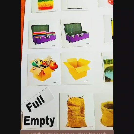 This exercise will build the concept of Full and Empty. Sort the cards by pairing, place the cards side by side, arrange the Full and Empty cards according to the name strips, encourage the child to relate to one another. Supports special needs: Suggested for children having Down Syndrome, Autism or any Learning Disability as prescribed by your therapist.