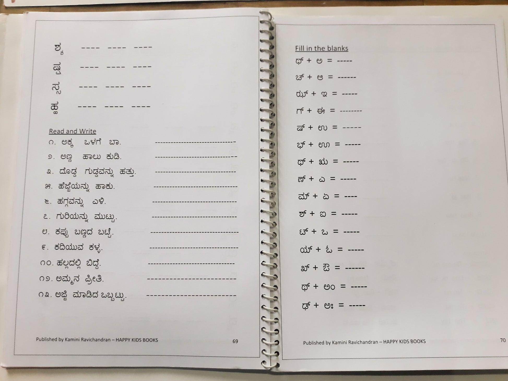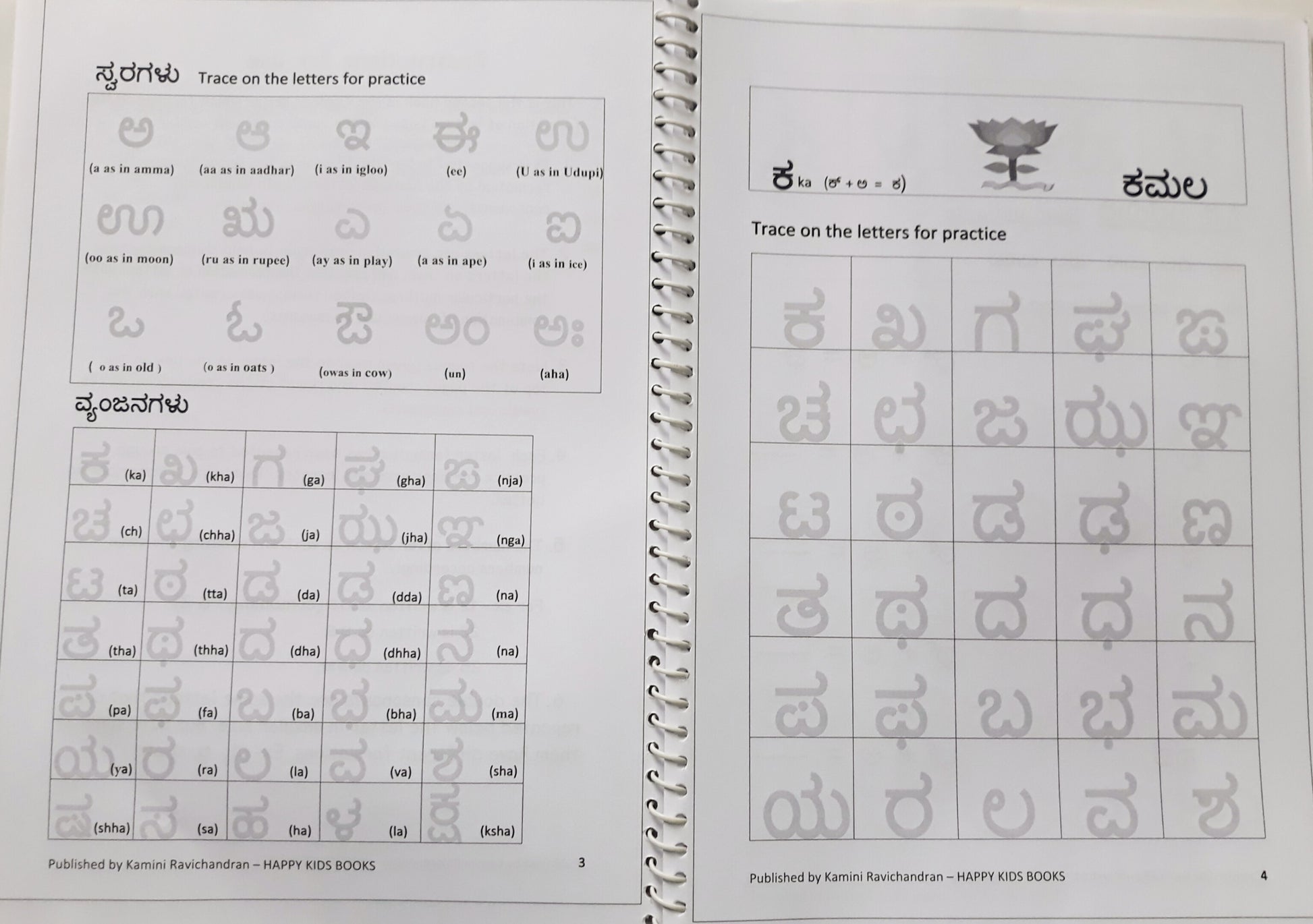 The Second book in the Kannada Series focuses on the vowel and consonant combinations of the alphabets. The formation and sound of the letters change as a result of the combination. The English pronunciation of the letter is given for reference. The letter combinations are given in grey color fonts to help children practice the formation by tracing on them. The repetition of the letters gives enough practice for children to remember them long enough
