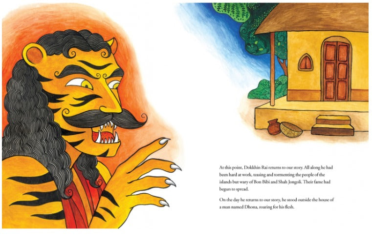 The quiet villages of Sundarban are terrorised by a monster with wild eyes, sharp teeth, striped skin and pointed nails — Dokkhin Rai! Until finally, Bon Bibi, protector of the forests and people, asks him a simple question: Why do you do this? The answer to this question is central to the age-old theme of human-animal harmony. Set in the lush and mysterious Sundarban in Bengal, the textured narrative and dramatic, detailed illustrations evoke the distinct culture of the place — the confluence of Hindu and Muslim mythologies, and the rhythm and concerns of everyday life at the edge of a forest.