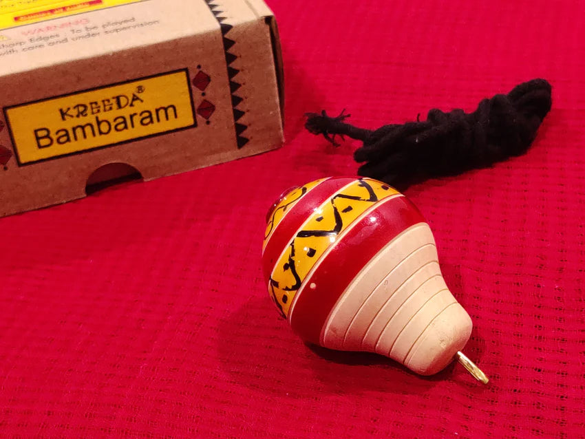 The Bambaram is a skill building top requiring the player to wind a rope around the frets of the top and flick it to the floor, causing the top to spin. Kreeda’s Bambaram is brightly coloured in the iconic red and yellow, and crafted by artisans in Channapatna. The non-rust nails, blunted on the tip make the top safer for the children.