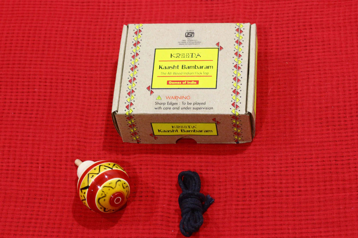 The Kaasht Bambaram is a skill building top requiring the player to wind a rope around the frets of the top and flick it to the floor, causing the top to spin. Kreeda’s Kaasht Bambaram is specially crafted for Kreeda by artisans in Channapatna and has a wooden nail for greater safety for young children.