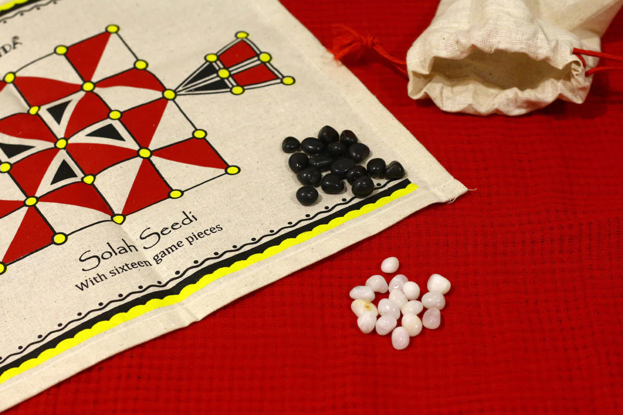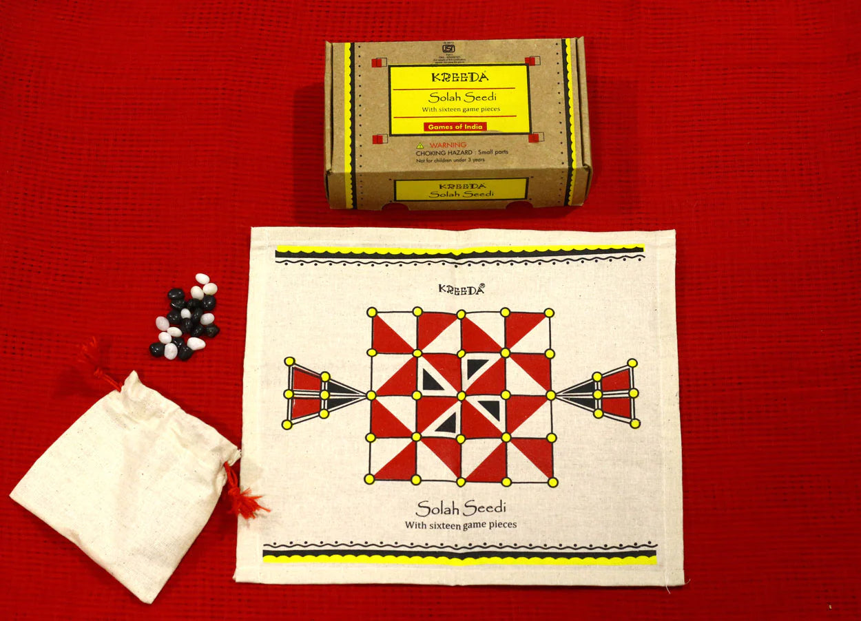 Solah Seedi is a battlefield game for two, where each player has 16 equally matched game pieces. The aim is to occupy enemy territory through strategic moves and planned efforts, thus defeating the opponent. An exciting game, popular across India. Look out for inscriptions of these boards in old temples and monuments – proof that it has been played for years.