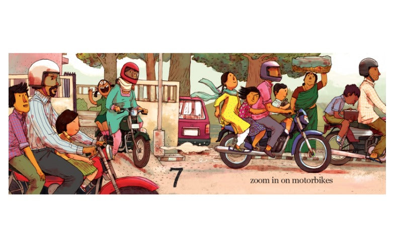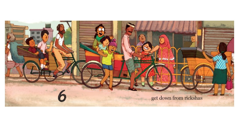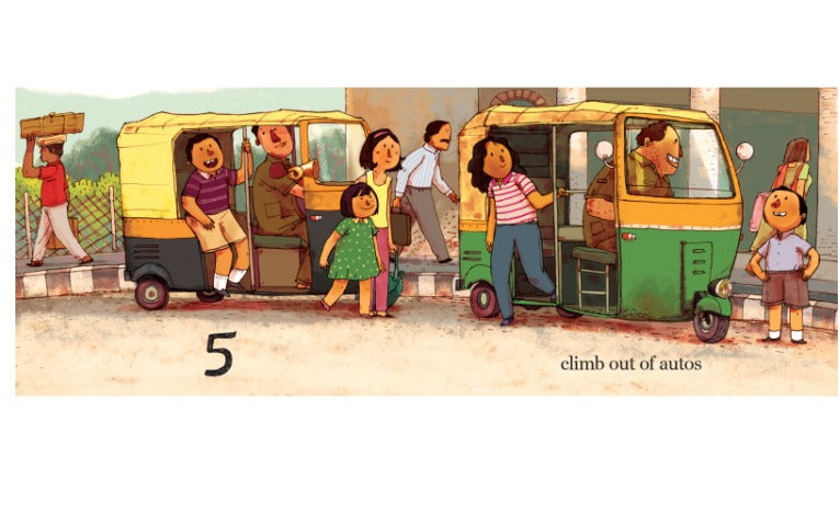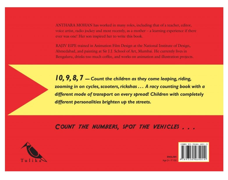 10, 9, 8, 7 count the children as they come leaping, riding, zooming in on cycles, scooters, rickshaws. A racy counting book with a different mode of transport on every spread!