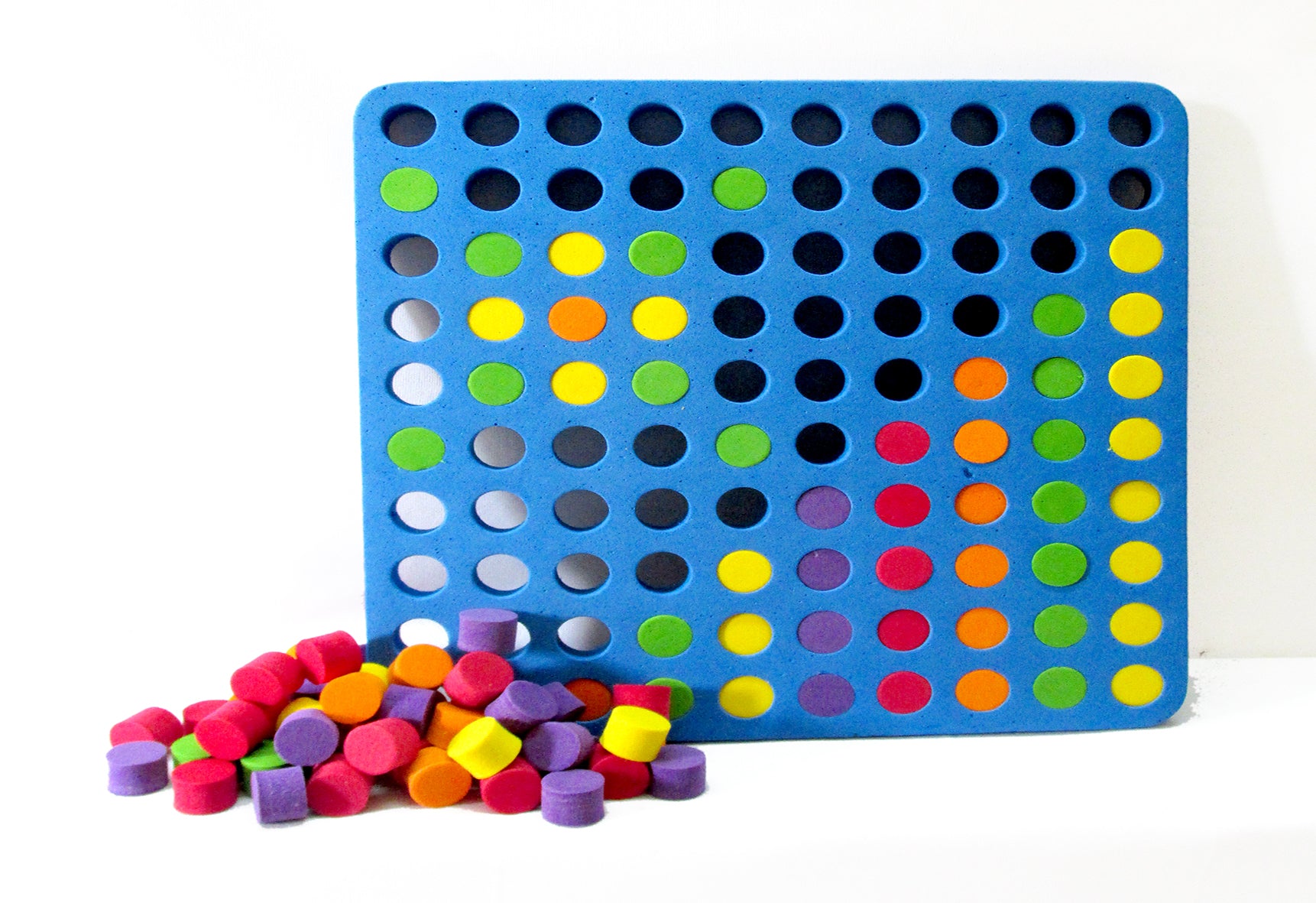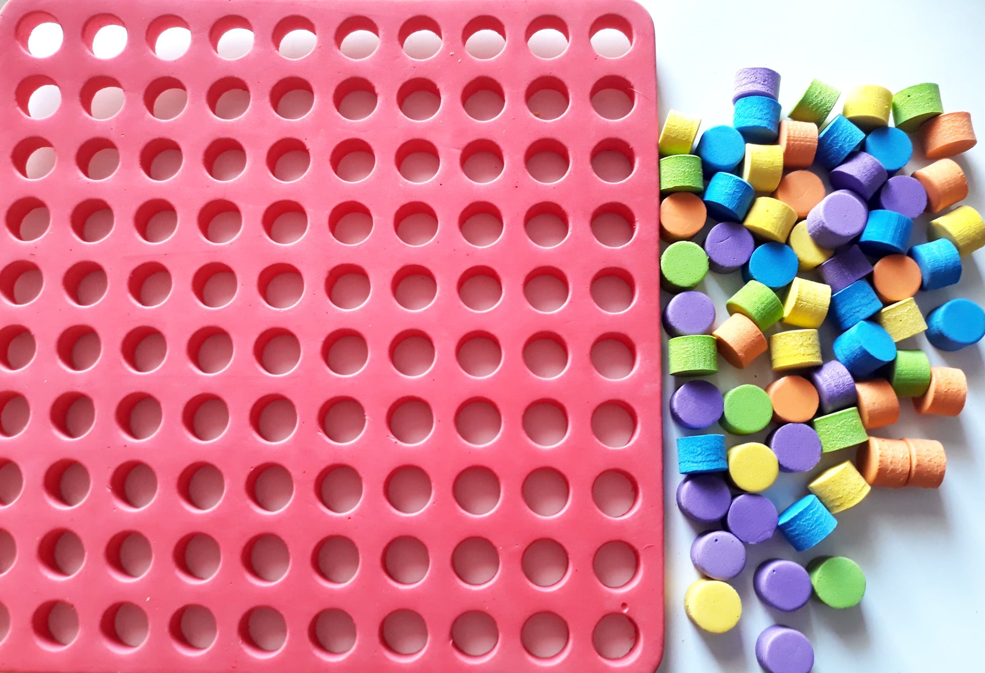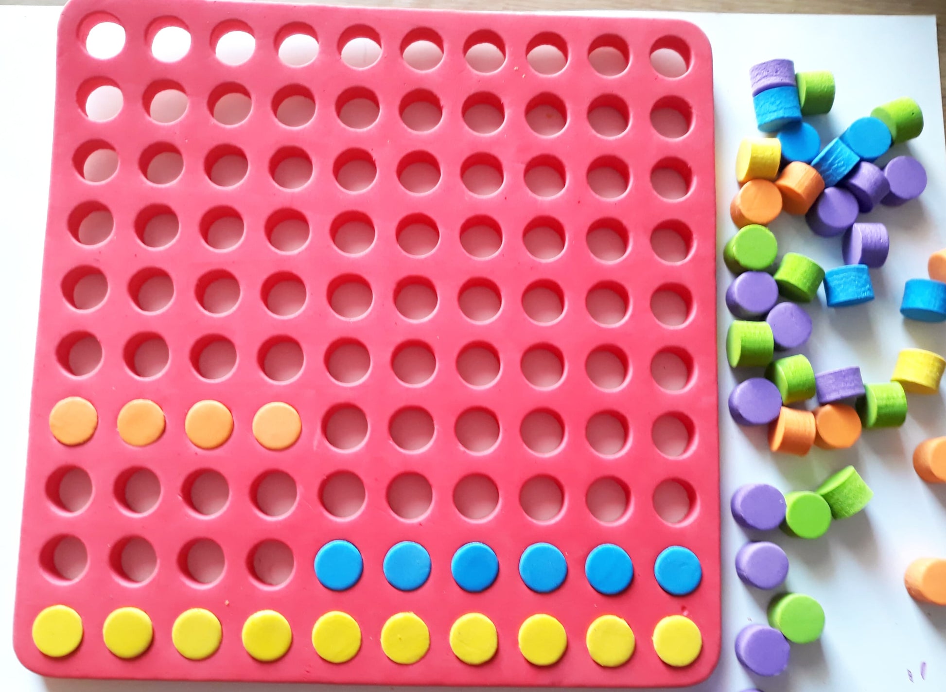 This helps in Pattern and Counting, Eye hand co-ordination, fine motor skills, making spatial patterns, Small number facts till 10, Small number addition and subtraction, One to one correspondence, Recognizing colours and classifying on basis of colour. A 10 x10 specially designed rubber mat with plugs for visual display of numbers, addition and multiplication in grid format.