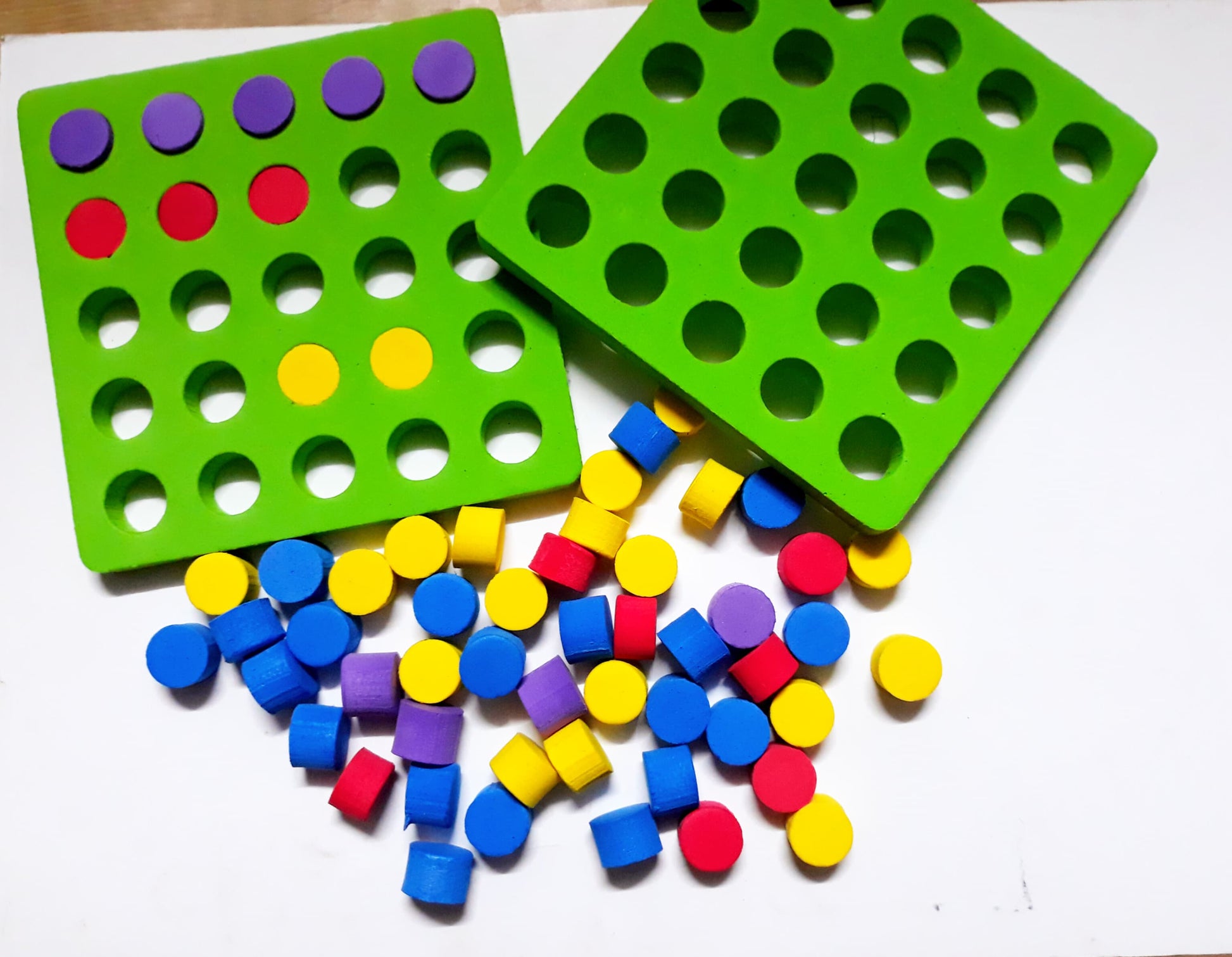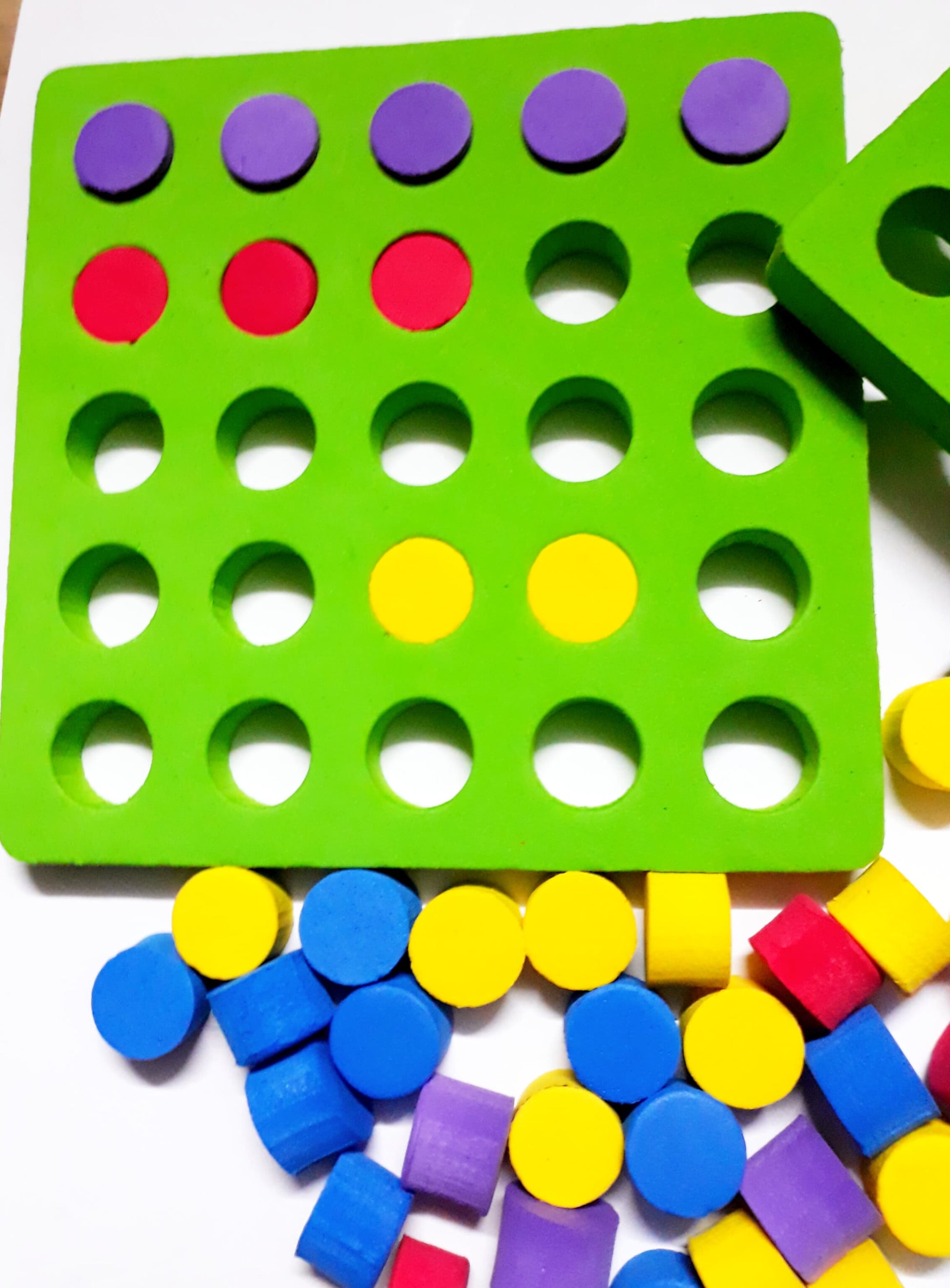 Pattern and Counting. Eye hand co-ordination and small motor skills. Making spatial patterns. Counting and number sense. Small number facts till 5. Small number addition and subtraction. One to one correspondence. Recognizing colors and classifying on basis of color. Two 5/5 specially designed rubber mats with plugs for pattern making and number facts - suitable for pre-school