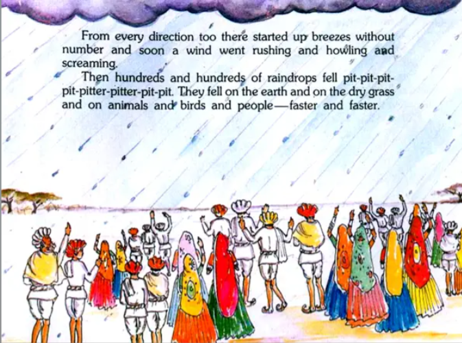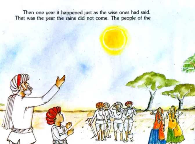 This is a charming story of a village which is affected by drought due to the fellling of trees. Simply told, it graphically describes the suffering of people, animals and plants and thus portraying the importance of preservation and conservation of nature.