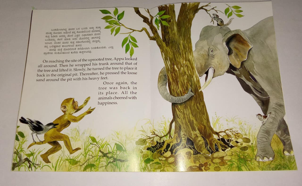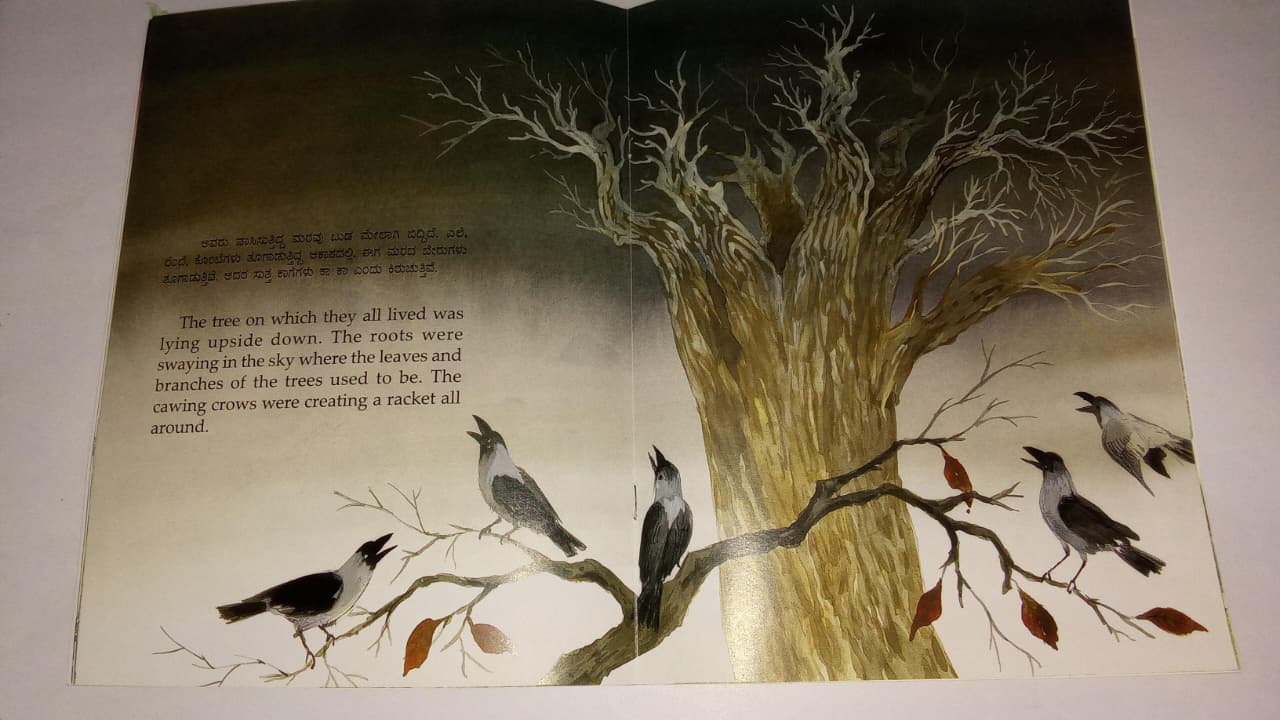 There is commotion amongst the inhabitants of a tree as a monkey suddenly falls down. As they look around carefully to their horror they discover that the tree they were living on is lying upside down. How did this happen? An interesting story on conservation of trees with visuals by author himself. This is a Bilingual book the text is deliberately simple to allow the two languages on the page to be as close as possible to each other, so one can be followed through the other.