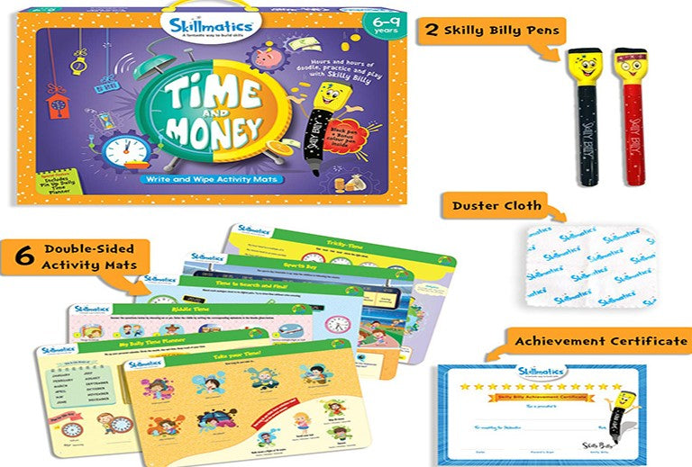 Time and Money - Write and wipe activity mats which build core skills through fun learning methodologies. 15 Highly engaging and repeatable activities. Includes 6 double-sided activity mats, 2 skilly billy magnetic pens, 1 duster cloth and 1 skilly billy achievement certificate. Helps develop problem solving, critical thinking, estimation, decision making, concentration. Children get to learn analogue and digital time, calculating and managing time, money management, mental maths, saving time and money, word problems. Building time and money management skills at an early age has never been more crucial! This set is an incredibly innovative product that introduces children to key concepts and builds the habit of saving at an early age all through fun activities! Whether it is shopping for school or solving time riddles, children are surely going to have hours and hours of fun.