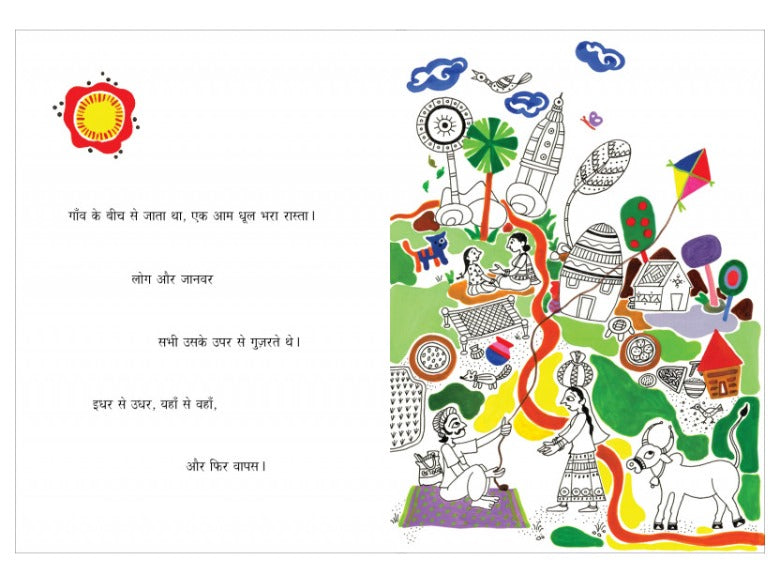 A dusty path runs through a village where people and animals keep walking up and down, up and down. Others, on faster feet and wheels, shout “Out of the way, out of the way.” In a simple lyrical way, the author subverts commonly held views on environment and development by showing simultaneously the growth of a wide-spreading tree and a busy winding road, with each making room for the other.