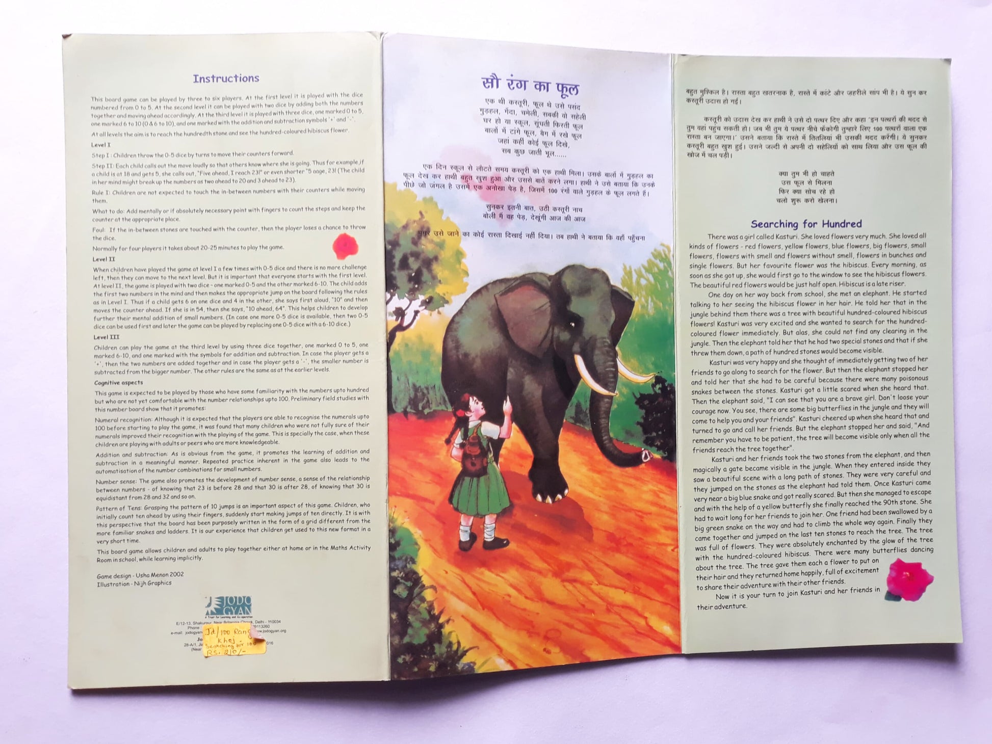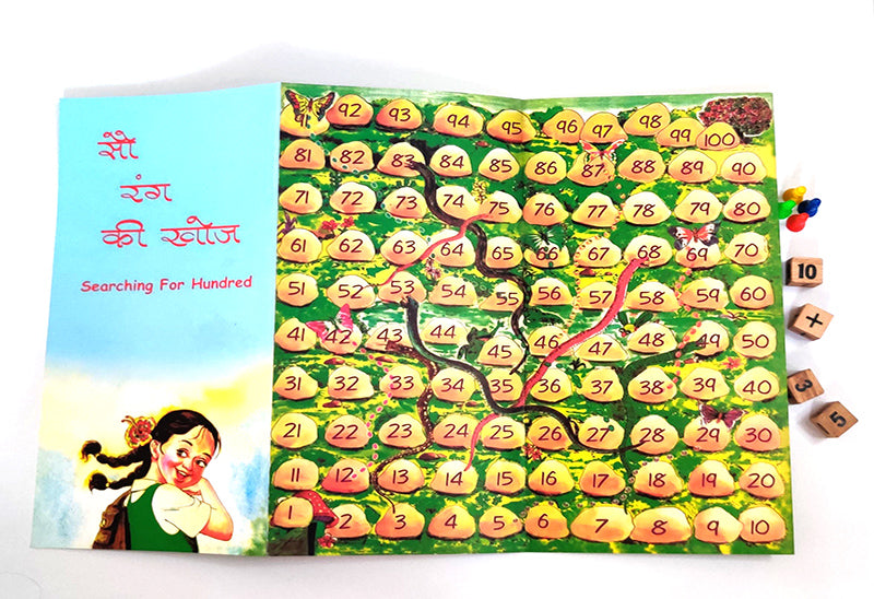 Game for mental addition and subtraction- Game can be played at different levels based on level of challenge needed. Opportunities for practising addition and subtraction up to 100 in an enjoyable game. Adding and subtracting mentally making use of the 10-base structure. Automatising small number addition and subtraction. Consolidating Number Sense. A board game with numbers 0 to 100 written in pattern of 10; four dice with two marked 0-5, one marked 6-11 and one marked with ‘+’ and ‘-‘ sign; and 4 pegs.. Includes writeup with details of activities. For 2 and above children