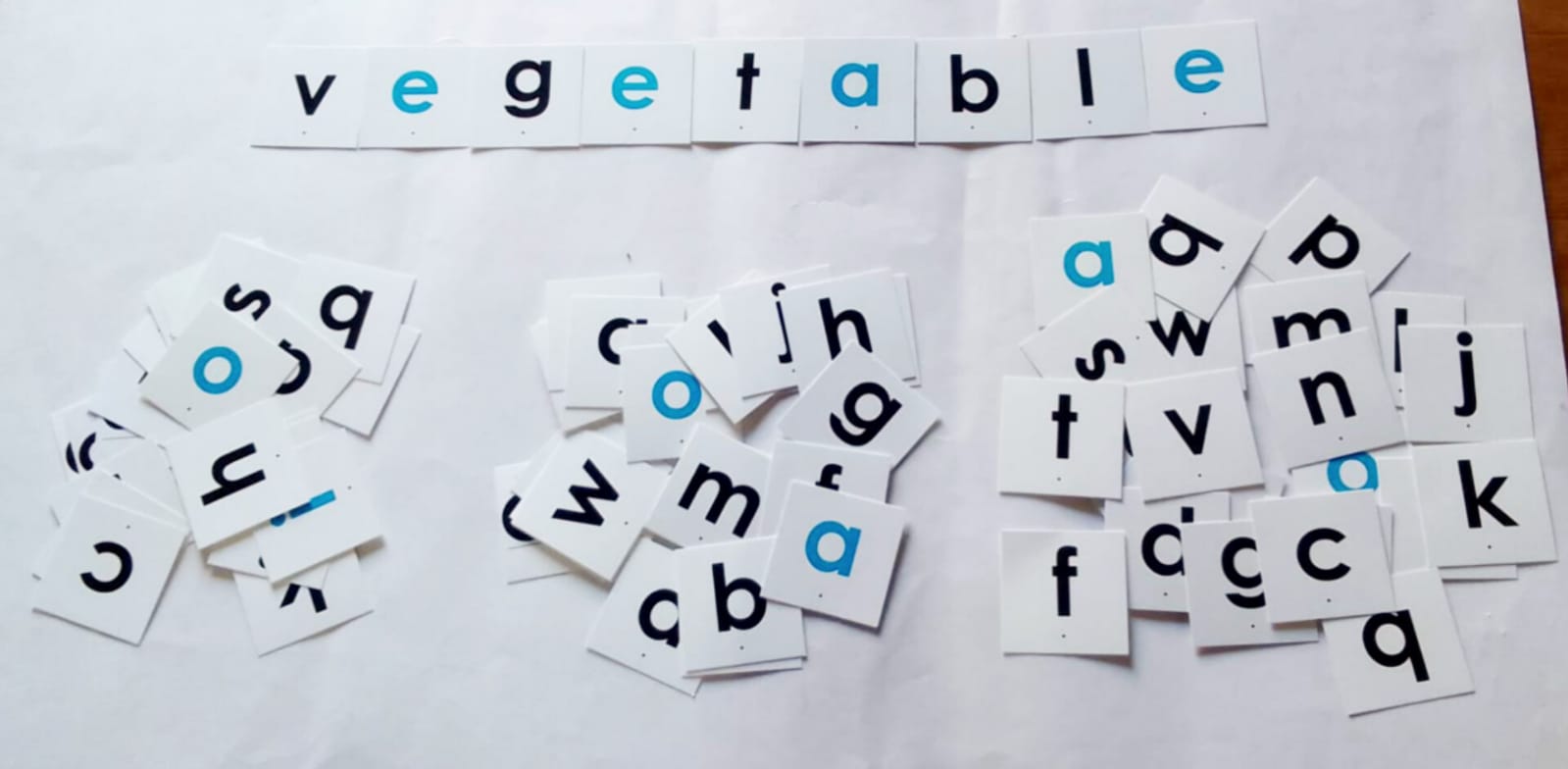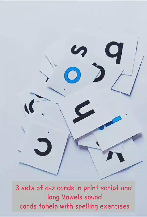 3 sets of a-z cards in print script and long vowel sound cards to help with spelling exercises. As the child makes new words she also adds to her vocabulary.