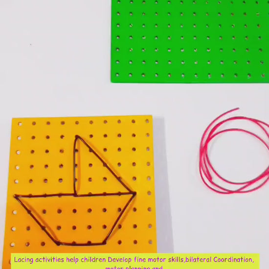 Lacing activities help children develop fine motor skills, bilateral coordination, motor planning and visual perceptual skills, wrist ability, observation, visual discrimination, creativity, eye hand coordination and concentration. In addition, lacing helps children practice the precursor skills for shoe tying and sewing. Lacing and sewing are both excellent activities that help a child improve their pincer grip, or the thumb and pointer finger grip.