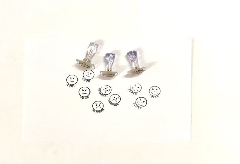 Set of 3 illustrated rubber stamps for marking children's work - Super, Good, Try Harder. Children love it. It's Fun pounding a stamp back and forth between stamp pad and paper making marks on paper these stamps used in free play and practicing develops fine motor skills. By using assorted stamp child can make picture cards, gift wrap paper etc. Stamps can by used to learn counting, patterns and also as sorting (e.g. If full set is used can be sorted as animal things, flowers etc)