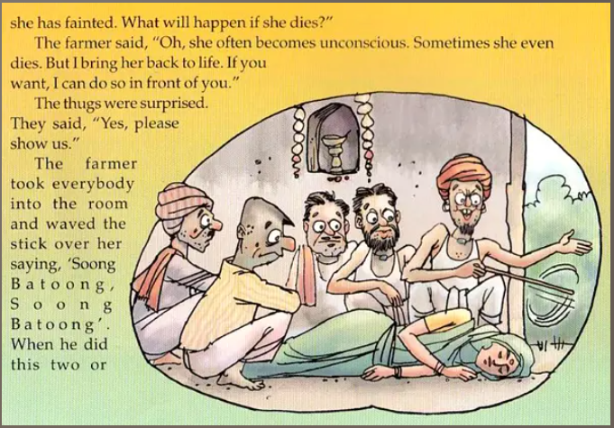 Charmingly illustrated story of how a farmer cleverly saves himself from being robbed by four thugs.