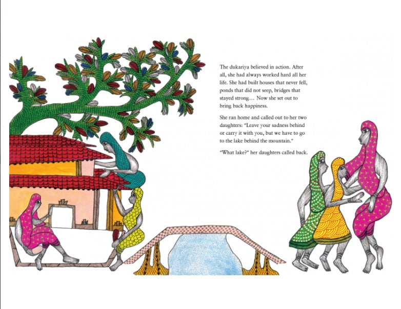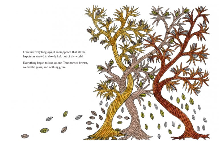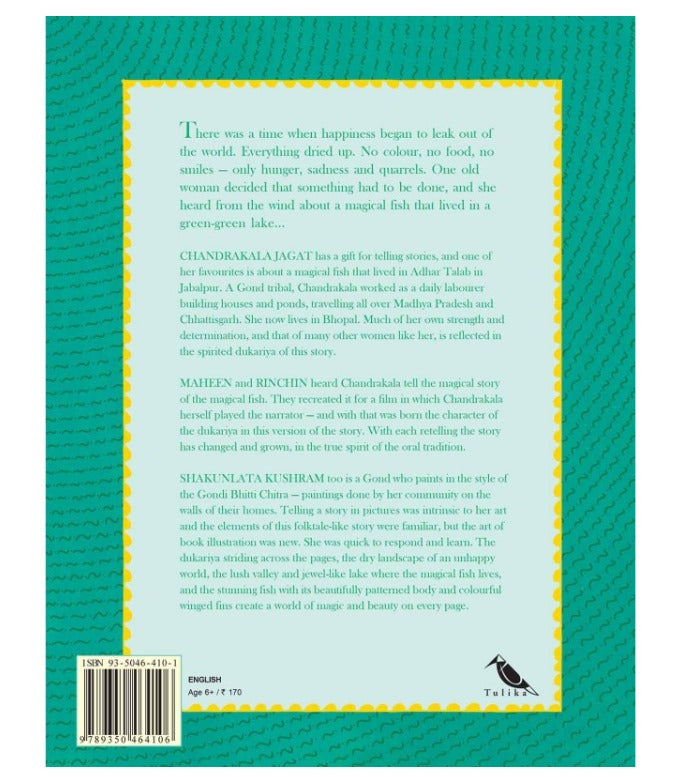 There was a time when happiness began to leak out of the world. Everything dried up. No colour, no food, no smiles only hunger, sadness and quarrels. One old dukariya decided that something had to be done, and she heard from the wind about a magical fish that lived in a green-green lake...