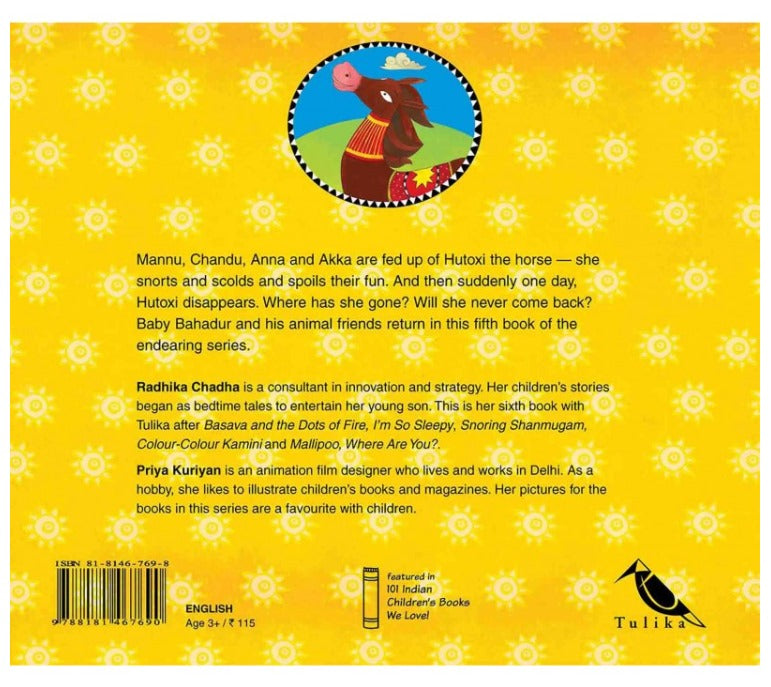 Mannu, Chandu, Anna and Akka are fed up of Hutoxi the horse-She snorts and scolds and spoils their fun. And then suddenly one day, Hutoxi disappears. Where has she gone? will she never come back? Baby Bahadur and his animal Friends return in this fifth book of the endearing series.