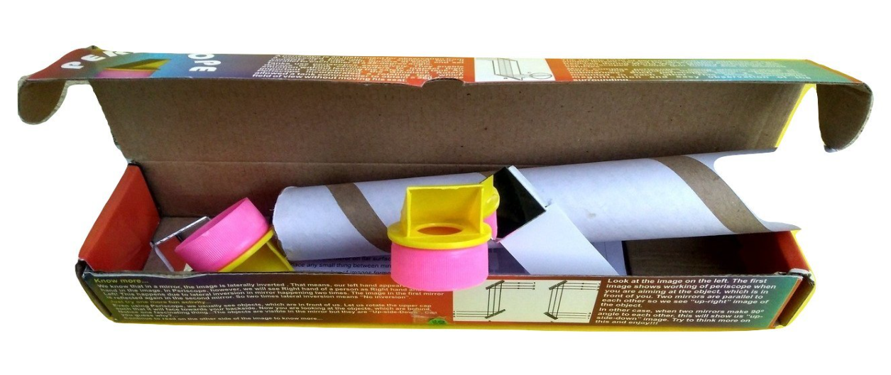 periscope, an instrument that allows you to see over or around obstacles using two 45-degree-angled mirrors positioned parallel to each other at either end of a tube. Light from an object reflects off the top mirror, travels down the tube, and reflects off the bottom mirror to your eye, illustrating the law of reflection at an angle of incidence equal to the angle of reflection. This educational kit helps children understand scientific principles through a hands-on, fascinating spying toy for observation from a concealed position.
