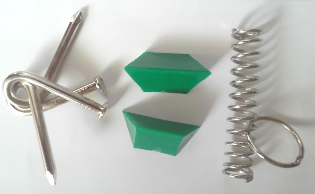 This Set of 3 independent puzzles Pyramid puzzle, Nail Puzzle and Spring puzzle. Its packed in small box of size 10cm * 8cm * 2 cm It's a good Brain Teaser, help to build Presentation, demonstration Skill, Confidence Booster Puzzle Solution Instructions are provided with pack