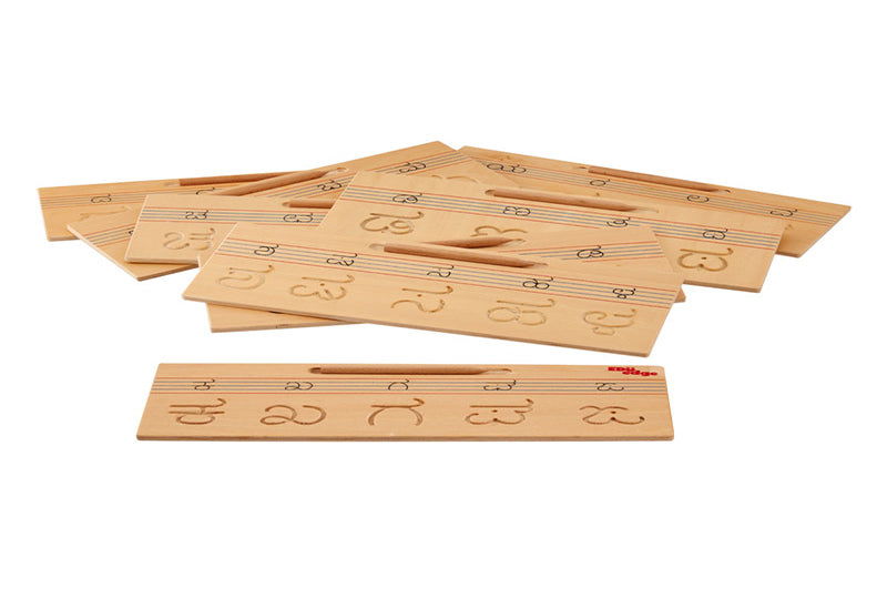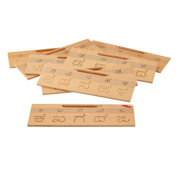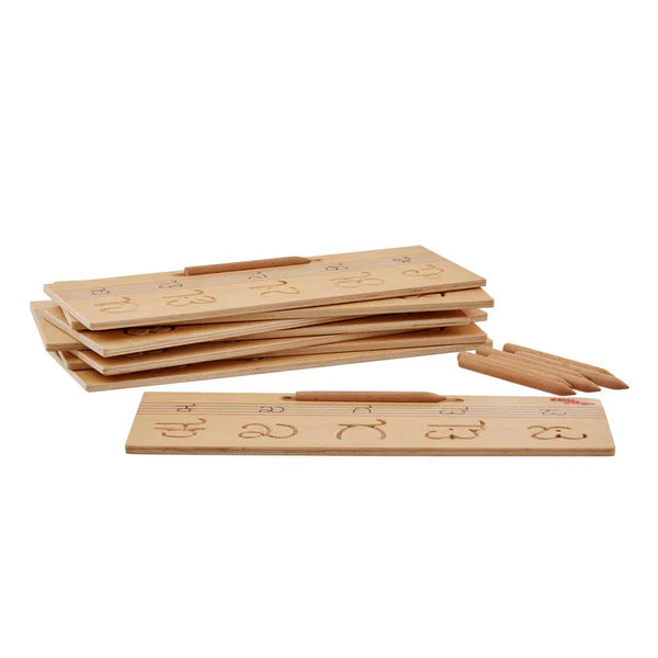 Enjoy tracing Kannada Letters on white plywood engraved boards with dummy pencil made from plastic or wood. Enhancing finger grip to hold pencil and wrist ability by moving pencil on engraved shapes of letters. Activity could be easily repeated till the skill is mastered as the pencil is dummy does not leave any impression on boards. Helps Enhance Language and Motor Skills. Develops pre-writing skills, eye hand co-ordination and concentration. This set has 8 plywood board and 8 dummy pencils.