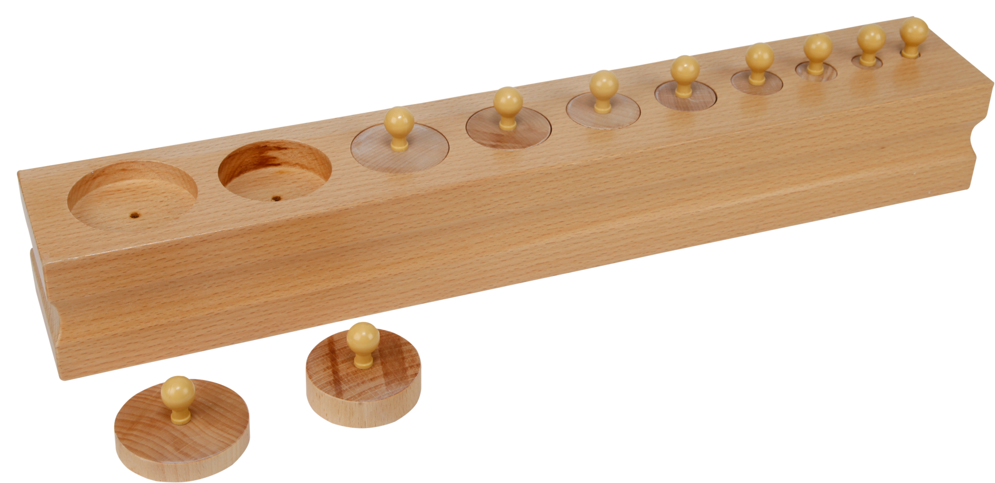 Cylinder blocks - 3 - one set of wooden block and 10 cylinders with sockets graded from big to small for exercise in size discrimination. These are standard Montessori materials for schools. This is one of the first materials in sensorial journey of the child. Cylinder size: 5.5 cm dia & 1 cm ht to 1 cm dia & 5.5 cm ht.