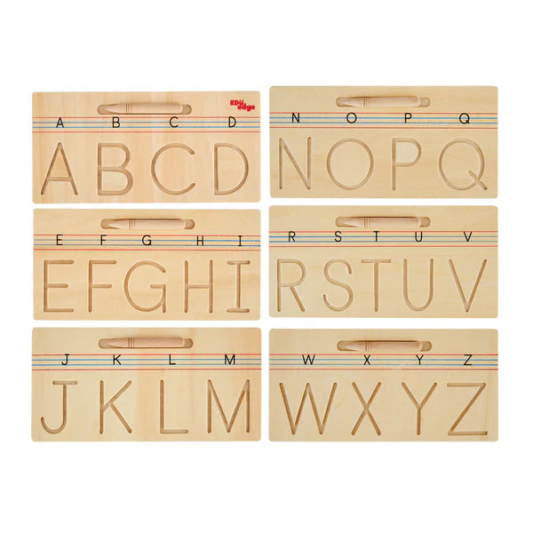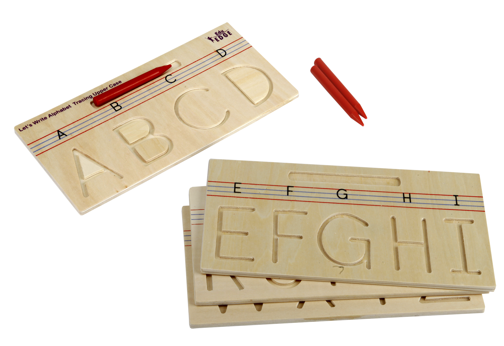 Enjoy tracing capital alphabet on white plywood engraved boards with dummy pencil made from plastic. Enhancing finger grip to hold pencil and wrist ability by moving pencil on engraved shapes of letters of alphabet. Activity could be easily repeated till the skill is mastered as the pencil is dummy does not leave any impression on boards.