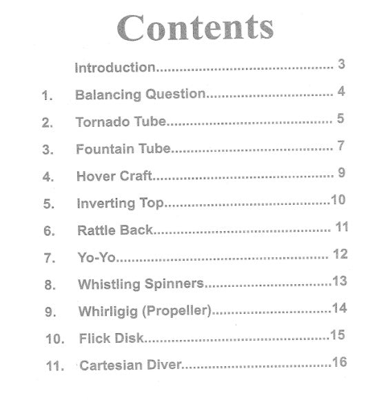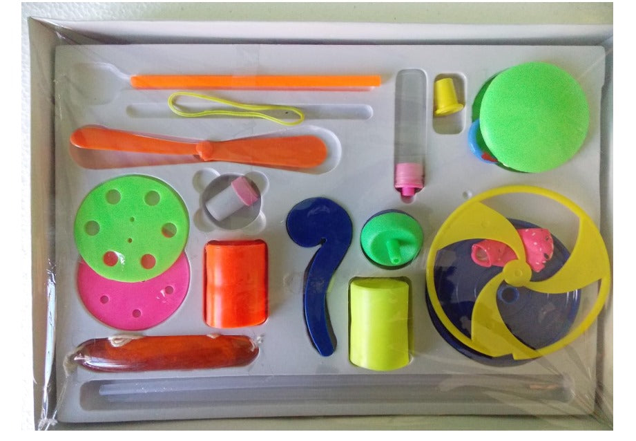 Wonder in Physics Kit includes unique set of 11 toys with perfect blend of fun, magic and simple science project. Kit includes balancing question, rattle back, tornado tube, whirling (propeller), gyroscopic top, fountain tube, inverting top, Cartesian diver, Hover craft, Yo-yo, Whistling spinners. Kit includes an instruction booklet explaining working of all toys and scientific principle associated with each toy. This product provides Joyful and Meaningful Learning Experience. Such activities instill wonder and fascination towards science among young students.